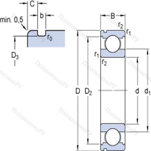 Однорядные радиальные шарикоподшипники с канавкой под стопорное кольцо 6205 N